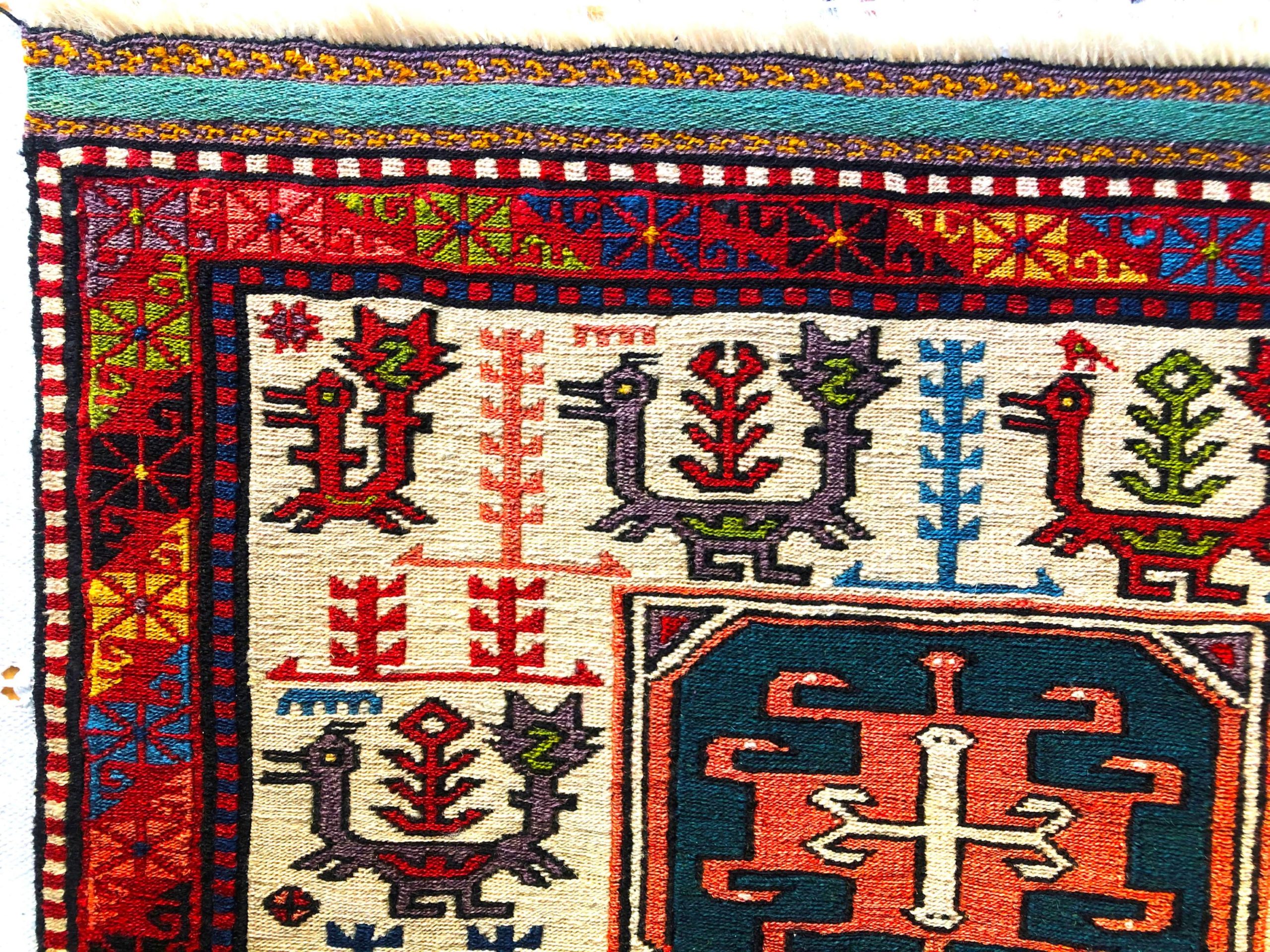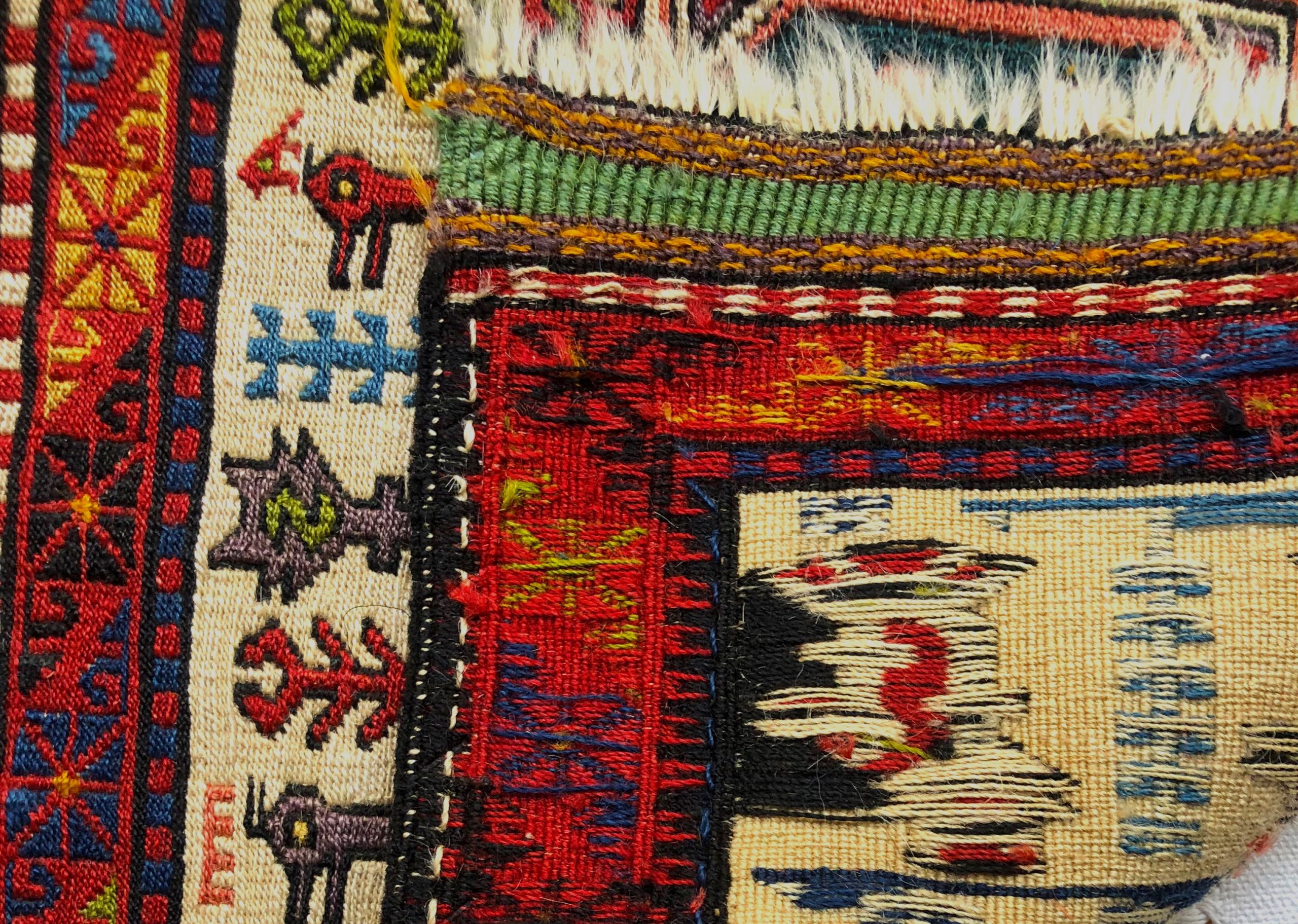 15 Ekim 2024Shahsavan bagface with very fine weave (70 warps/10 cm) sumak technique, with silk wefts. Stylized animals and vegetal designs used. Very fine handspun wool and 100% natural dyes are used.
