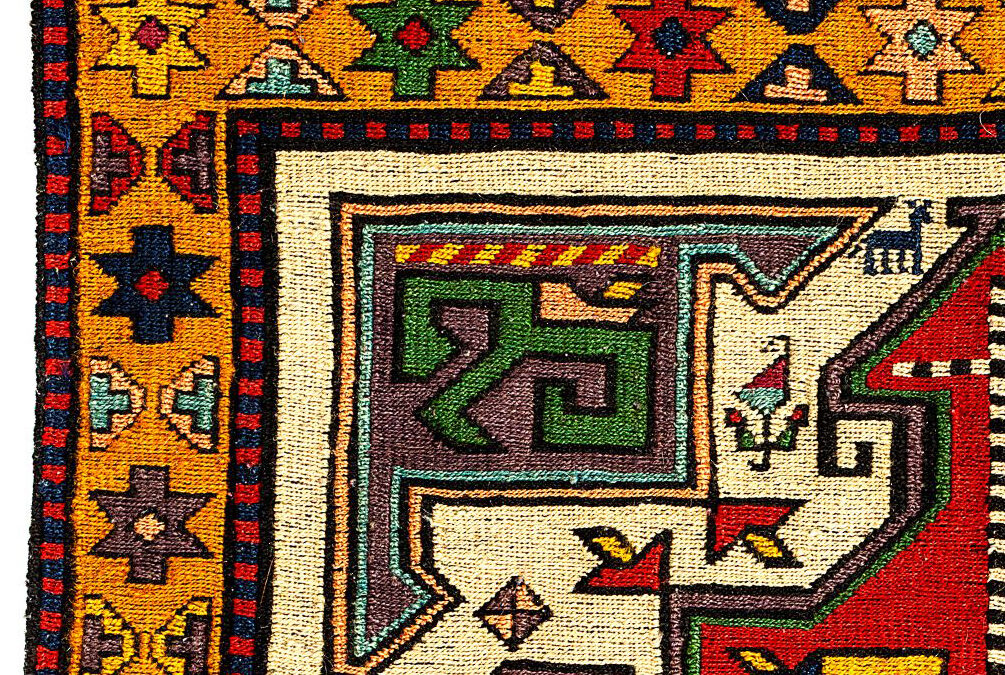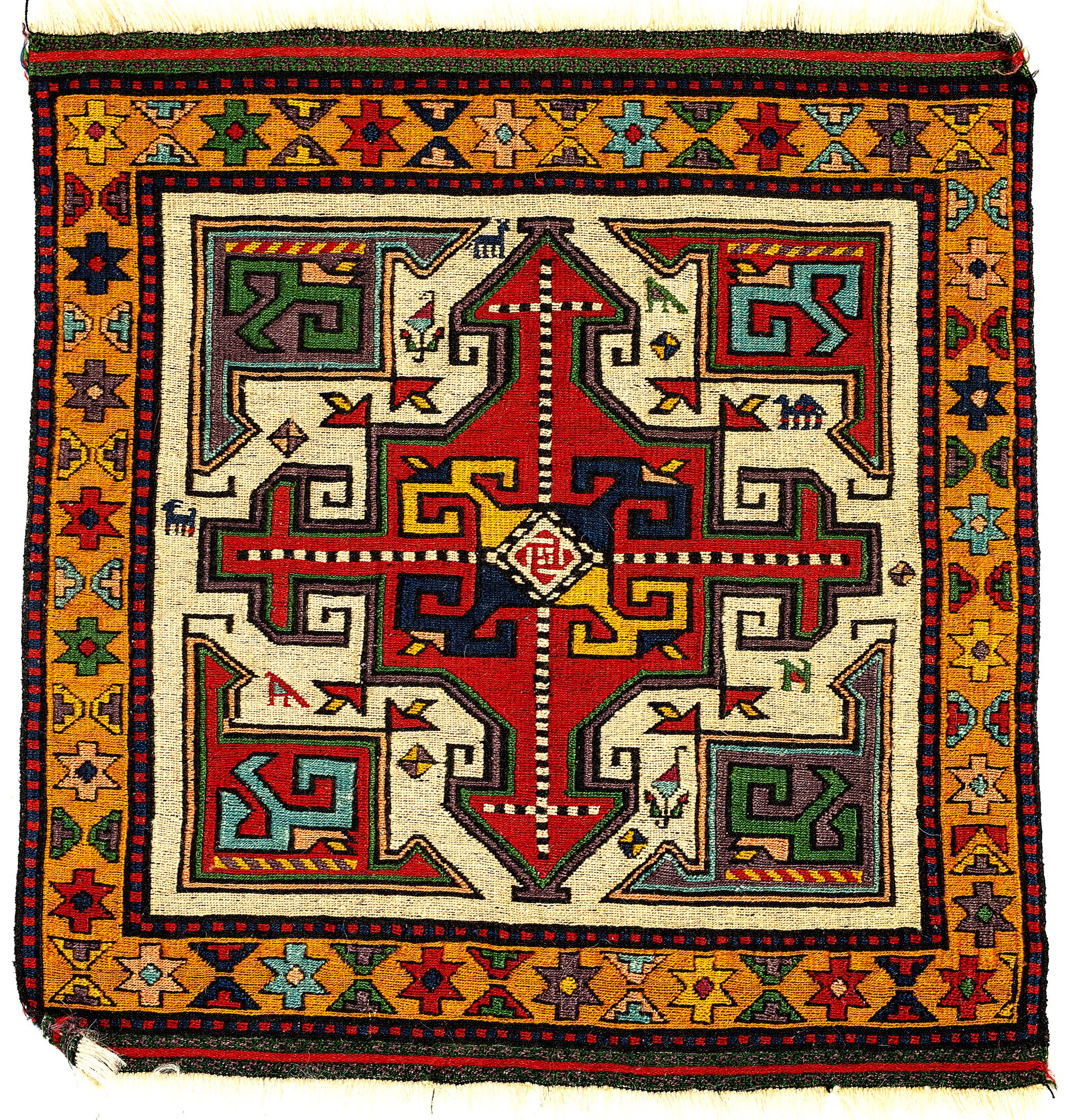 Ekim 15, 2024Shahsavan Bagface with The Classical Four Directions Design. Very fine weave (70 warps/10 cm) sumak technique. The archaic four directions pattern is used, with some little stylized animals scattered on the surface. Vegetal dyes are used with very good quality classical colors. Very fine handspun wool with 100% natural dyes are used.